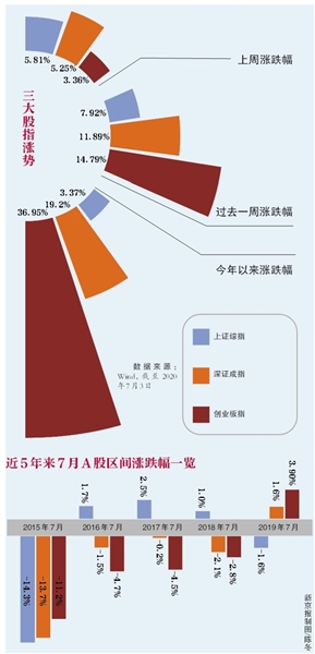 新京報記者統(tǒng)計了2010年7月-2019年7月間的數據發(fā)現(xiàn),事實上,指數在過去的10年中上漲與下跌的各約占半數。其中,滬指方面,近10年里,滬指6次在7月出現(xiàn)上漲,4次出現(xiàn)下跌。2010年7月為近10年的7月里上漲幅度最高的一年,漲幅為9.97%;2015年7月,滬指大幅下跌14.34%,是十年中7月跌幅最高的一年。