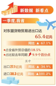 我省對東盟進出口主要呈現(xiàn)以下特點:從國別看,一季度我省對東盟10國進出口值中,印度尼西亞居首位,進出口32.9億元,占全省對東盟進出口值的50.3%;其次為新加坡,進出口13.5億元,占全省對東盟進出口值的20.7%;對東盟10國的進出口中有7國實現(xiàn)增長,其中對印度尼西亞和緬甸實現(xiàn)成倍增長。我省對東盟出口機電產(chǎn)品19億元,同比增長50.2%,占全省對東盟出口值的69.8%。主要進口商品中,鐵合金出現(xiàn)大幅增長,各類金屬礦及礦砂量減值增,我省自東盟進口鐵合金11.5萬噸、貨值18.9億元,分別增加14.4倍和增長10.2倍,占全省自東盟進口值的49.3%,全部來自印度尼西亞;進口各類金屬礦及礦砂29.6萬噸,貨值5.8億元。