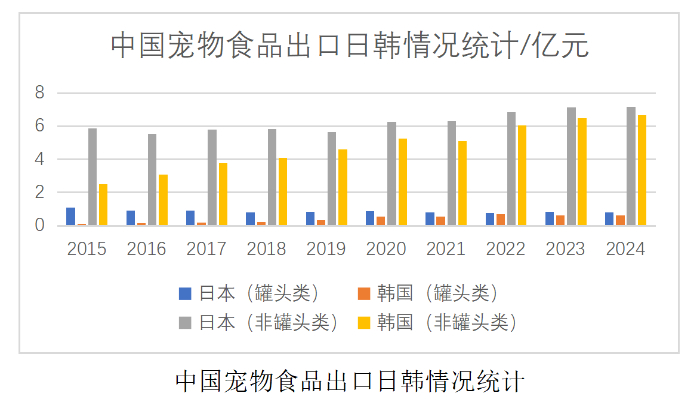 王金全分析認為,日韓是我國寵物食品重要出口地,2022年占出口總額12%,中國品牌憑性價比與差異化切入日本市場,2024年對韓非罐裝類出口額較2015年翻倍。