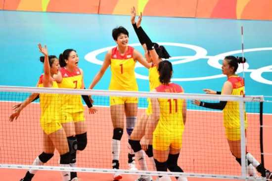 (圖為里約奧運(yùn)會(huì)女排小組賽中,中國隊(duì)球員在與波多黎各隊(duì)比賽中慶祝得分。新華社圖片)