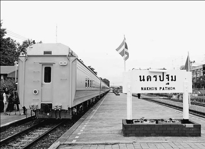 “中國(guó)造”新鐵路列車停靠在泰國(guó)佛統(tǒng)府車站。