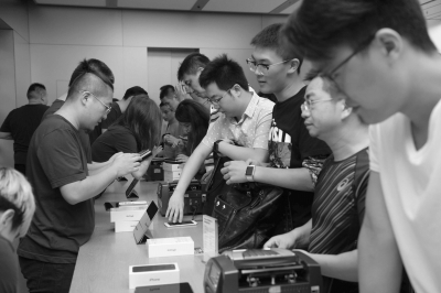 iPhone7開賣后受追捧,圖為開賣首日華貿蘋果店現(xiàn)場。京華時報記者陶冉攝