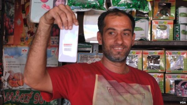 印度邁索爾一位集市攤主展示他的小米手機(jī)。(美國之音電臺網(wǎng)站)