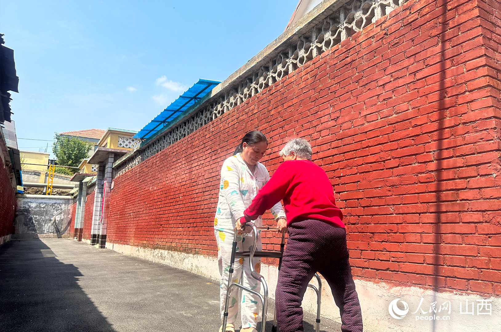 臨近中午,暖陽正好。村民李連香正扶著77歲的母親康復(fù)訓(xùn)練。李連香微微將助步器向前移動,母親跟著緩緩向前。跟母親聊聊小時候的故事,問問她想吃什么……一言一語間,母女二人面對面慢慢移動著,走累了,就原地歇一會。