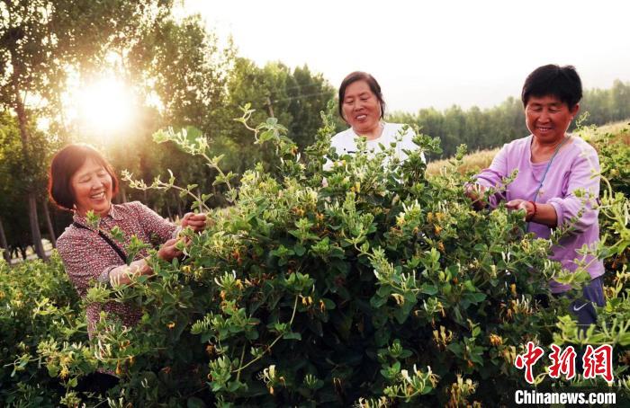 夕陽下,山西省運城市新絳縣澤掌鎮(zhèn)喬溝頭村,花農(nóng)趙藕平(左)和鄰里采摘豐收的金銀花。高新生 攝
