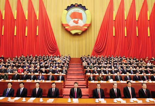 3 月15 日,中國(guó)人民政治協(xié)商會(huì)議第十三屆全國(guó)委員會(huì)第一次會(huì)議在北京閉幕。這是習(xí)近平、李克強(qiáng)、張德江、俞正聲、張高麗、栗戰(zhàn)書、王滬寧、趙樂際、韓正等在主席臺(tái)就座。新華社記者 丁 林 攝