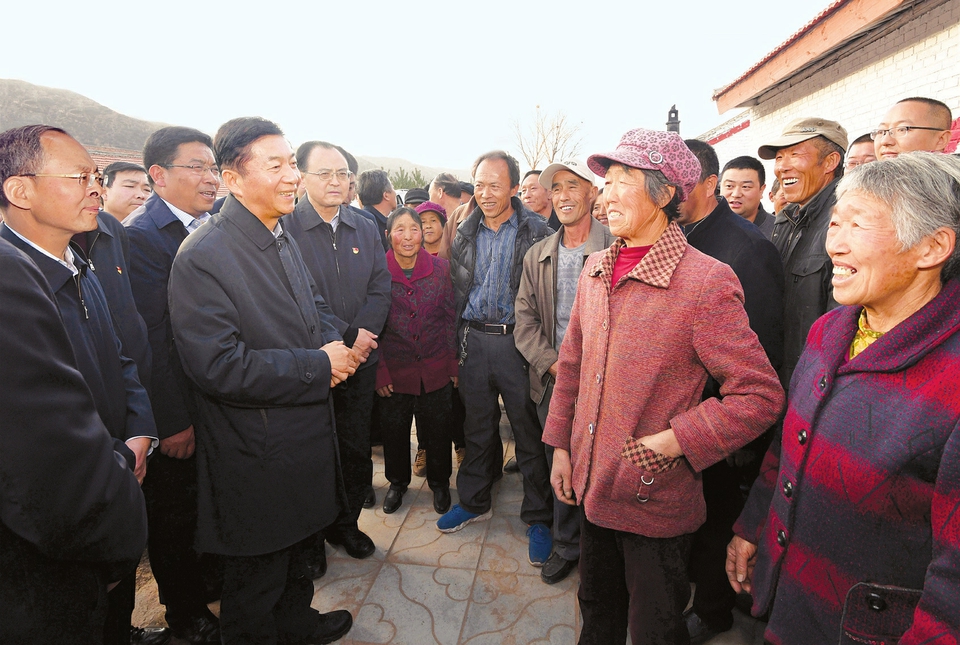 省委書記、省人大常委會主任駱惠寧在寧武縣西馬坊鄉(xiāng)榆木橋村考察時,與村民們親切交談,了解生產(chǎn)生活,并向大家講授秋季覆膜保墑的技術要領。本報記者 李聯(lián)軍 攝