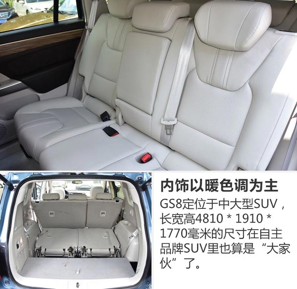 GS8的設(shè)計由原奔馳設(shè)計師張帆操刀,在內(nèi)飾部分也較為洞察國內(nèi)消費者的喜好。車內(nèi)整體寬敞舒適,顏色采用偏暖的木色,打造一種家用溫馨感??臻g方面,GS8的長寬高分別為4810*1910*1770毫米,軸距2800毫米,采用7座布局。