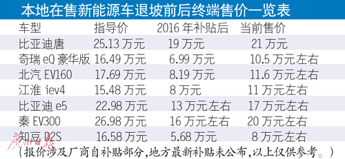 新能源車已經不是新鮮玩意了,不少老廣們也已經開上了北汽、比亞迪、奇瑞等本土品牌的純電動車,成為環(huán)保達人。不過今年也想加入純電動汽車車主行列的話,代價要“昂貴”一點了。近期,記者留意到,不少新能源車4S店掛出了車輛“補貼退坡”后的新售價,車價普遍比去年上漲3萬~5萬元。這一價格變化,也讓不少想走新能源車上牌便利的老廣們打了退堂鼓。