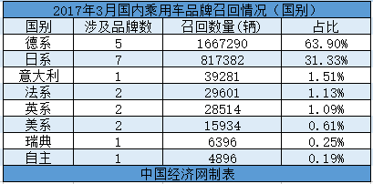 根據(jù)國(guó)家質(zhì)檢總局缺陷產(chǎn)品管理中心3月份發(fā)布的召回公告,中國(guó)經(jīng)濟(jì)網(wǎng)汽車頻道經(jīng)過匯總、統(tǒng)計(jì),整理出“3月國(guó)內(nèi)乘用車召回榜單”。3月份,中國(guó)汽車市場(chǎng)內(nèi)共有21個(gè)汽車品牌發(fā)布了累計(jì)36次召回公告,共計(jì)召回2609294輛汽車。