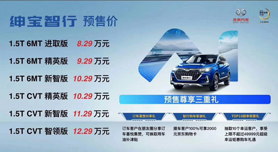 據(jù)悉,從8月31日成都車展開始,北京汽車已經(jīng)啟動(dòng)了紳寶智行預(yù)售活動(dòng),并推出訂車喜悅分享禮、智行購(gòu)車答謝禮、TOP10超幸鉅惠禮三重大禮,最高能省49999元。