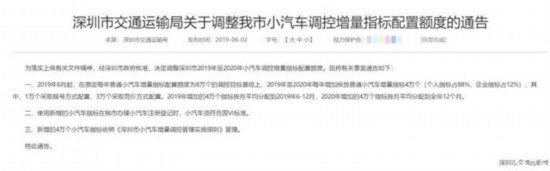《深圳市交通運輸局關(guān)于調(diào)整我市小汽車調(diào)控增量指標配置額度的通告》內(nèi)容如下:2019年6月起,在原定每年普通小汽車增量指標配置額度為8萬個的調(diào)控目標基礎(chǔ)上,2019年至2020年每年增加投放普通小汽車增量指標4萬個(個人指標占88%,企業(yè)指標占12%),其中,1萬個采取搖號方式配置,3萬個采取競價方式配置。2019年增加的4萬個指標按月平均分配到2019年6-12月,2020年增加的4萬個指標按月平均分配到全年12個月;使用新增的小汽車指標在我市辦理小汽車注冊登記時,小汽車須符合國VI標準;新增的4萬個小汽車指標依照《深圳市小汽車增量調(diào)控管理實施細則》管理。