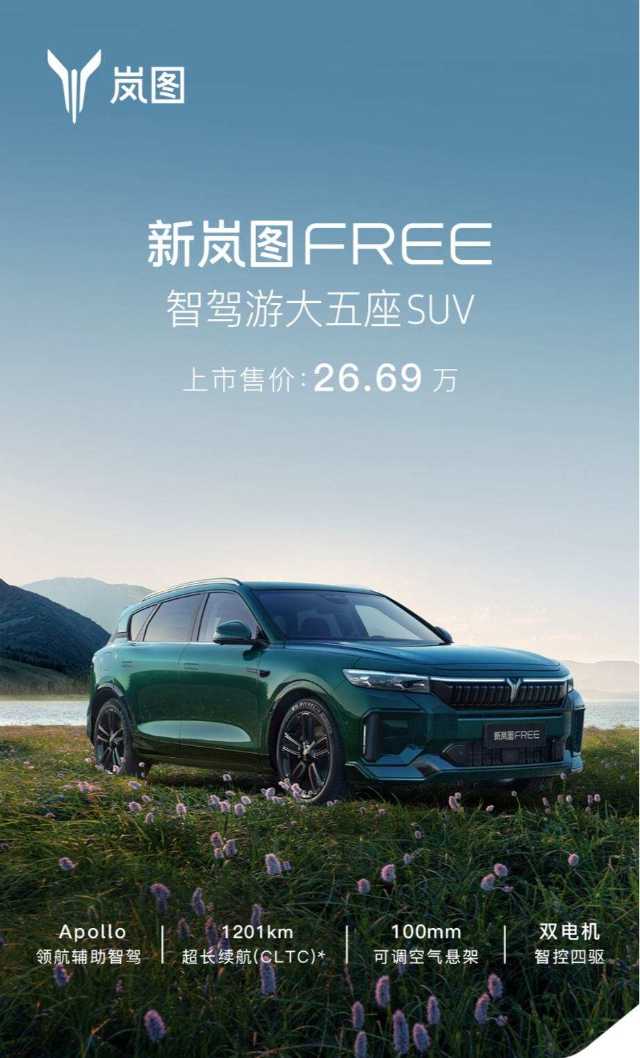 8月19日,新嵐圖FREE在2023 VOYAH NIGHT嵐圖用戶之夜正式上市,售價(jià)26.69萬元。新嵐圖FREE采用新外觀、新內(nèi)飾、新動(dòng)總、新智駕,定位“智駕游大五座SUV”,首搭百度Apollo Highway Driving Pro領(lǐng)航輔助智駕;全系標(biāo)配四驅(qū)系統(tǒng)和空氣懸掛;采用1.5T深度米勒循環(huán)增程器,CLTC綜合續(xù)航里程達(dá)到1201km,純電續(xù)航里程210km,是嵐圖FREE車型自上市以來的首次全面煥新升級(jí)。