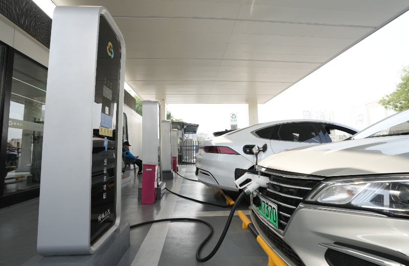 (資料照片)10月12日,在北京木樨園公交場(chǎng)站一座超級(jí)充電站內(nèi),新能源小客車(chē)在充電。新華社記者 鞠煥宗 攝