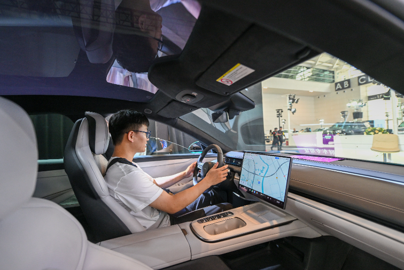 觀眾在2024世界智能產(chǎn)業(yè)博覽會現(xiàn)場靜態(tài)體驗一款智能網(wǎng)聯(lián)電動汽車(6月22日攝)。新華社記者 孫凡越 攝