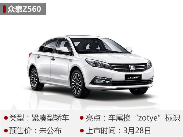 Z500是眾泰汽車旗下一款緊湊型轎車,其改款車型Z560將于3月28日正式上市。外觀方面,新車前臉保留雙橫幅式進氣格柵及鷹眼式前大燈組合,視覺效果比較大氣。而新車尾部則取消牌照框上方的Z型LOGO,更換為眾泰最新的“zotye”字樣標識。內(nèi)飾方面,眾泰Z560儀表盤有所升級,增加了帶有行車電腦的中間液晶屏幕。新車將延用1.5T動力系統(tǒng),匹配5擋手動變速箱或CVT自動變速箱。其中,搭配手動變速箱車型最大功率將達105kW,峰值扭矩207Nm。