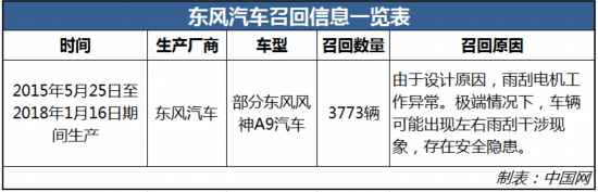 中國網(wǎng)汽車11月4日訊 近日,記者從國家市場監(jiān)督管理總局缺陷產(chǎn)品管理中心官網(wǎng)獲悉,東風汽車集團股份有限公司乘用車公司向國家市場監(jiān)督管理總局備案了召回計劃,自2019年11月8日起,召回2015年5月25日至2018年1月16日期間生產(chǎn)的部分東風風神A9汽車,共計3773輛。