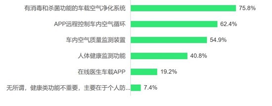 被調(diào)查的有車一族也希望在車內(nèi)增加空氣凈化和空氣質(zhì)量監(jiān)測裝置。除此以外,人體健康監(jiān)測功能和在線醫(yī)生等與健康相關(guān)的功能和配置也愈發(fā)受到車主重視。汽車廠商應(yīng)用具備車內(nèi)空氣健康、安全的汽車新品,滿足消費者的需求。