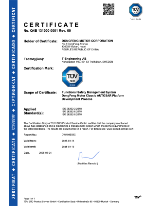 東風(fēng)汽車自主AUTOSAR平臺(tái)獲得ISO 26262 ASIL-D級(jí)流程認(rèn)證證書,充分證明了該平臺(tái)在功能安全流程管理、風(fēng)險(xiǎn)分析、開發(fā)驗(yàn)證等方面均滿足最高安全等級(jí)要求,能夠有效支撐智能駕駛、新能源汽車等場(chǎng)景下對(duì)高安全性的需求,進(jìn)一步彰顯了東風(fēng)汽車在功能安全領(lǐng)域的技術(shù)底蘊(yùn)。