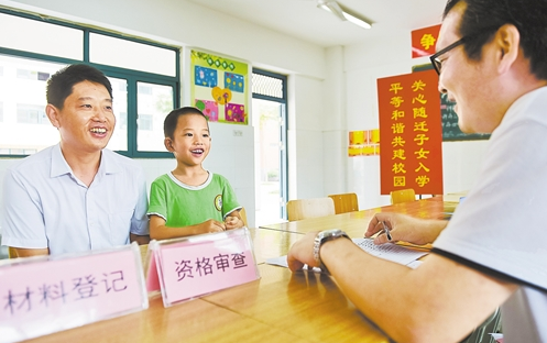 在安徽合肥市和平小學(xué)花沖分校報(bào)名點(diǎn),畢權(quán)航和父親畢金倉(左)在辦理報(bào)名入學(xué)相關(guān)手續(xù)(2017年7月12日攝)。合肥市瑤海區(qū)進(jìn)城務(wù)工人員隨遷子女入學(xué)報(bào)名工作啟動(dòng)后,該區(qū)教育部門在各定點(diǎn)學(xué)校設(shè)置“隨遷子女入學(xué)幫你辦”窗口,安排工作人員協(xié)助辦理,同時(shí)設(shè)置家長意見箱,監(jiān)督入學(xué)辦理的全過程。 新華社記者 張 端攝