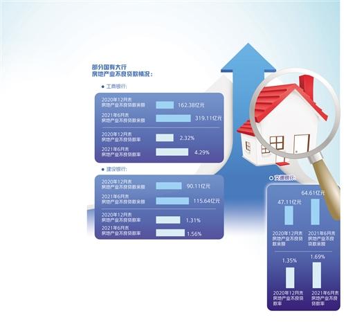 從國有大行已披露數(shù)據(jù)看,截至2021年6月末,中國工商銀行、中國建設(shè)銀行、交通銀行的房地產(chǎn)業(yè)不良貸款余額分別為319.11億元、115.64億元、64.61億元,較去年年末上升156.73億元、25.53億元、17.50億元;房地產(chǎn)業(yè)不良貸款率分別為4.29%、1.56%、1.69%,較去年年末上升1.97個(gè)百分點(diǎn)、0.25個(gè)百分點(diǎn)、0.34個(gè)百分點(diǎn)。
