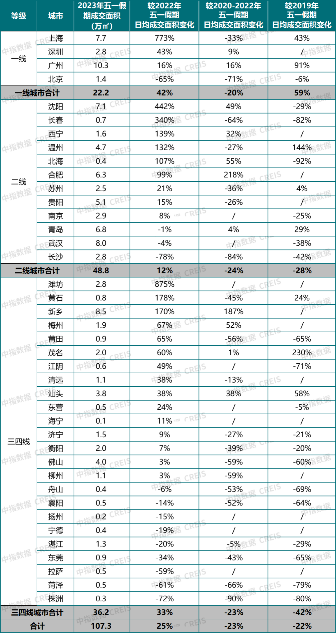 根據(jù)中指研究院數(shù)據(jù),2023年“五一”期間,代表城市成交規(guī)模較去年五一假期增長(zhǎng)約25%,其中多個(gè)城市受低基數(shù)影響,同比增幅較大,但整體較2019年同期降幅仍超兩成。