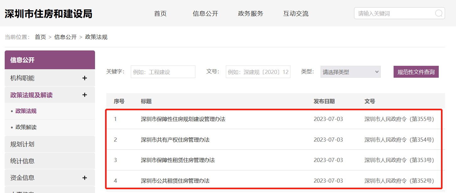 央廣網(wǎng)北京7月5日消息 據(jù)深圳市住房和建設(shè)局網(wǎng)站消息,7月3日,深圳市住建局發(fā)布《深圳市公共租賃住房管理辦法》《深圳市保障性租賃住房管理辦法》《深圳市共有產(chǎn)權(quán)住房管理辦法》《深圳市保障性住房規(guī)劃建設(shè)管理辦法》,具體來看,上述四項管理辦法,分別對公共租賃住房、共有產(chǎn)權(quán)住房、保障性租賃住房等三類住房的保障對象、申請條件、供應(yīng)分配方式、租售價格標(biāo)準(zhǔn)、用地保障、建設(shè)籌集主體和渠道、建設(shè)標(biāo)準(zhǔn)、監(jiān)督管理等進(jìn)行了規(guī)范。四項管理辦法將于8月1日正式實施。