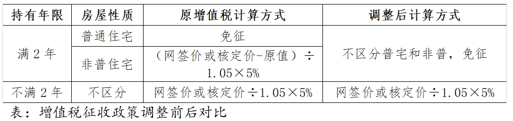 增值稅方面,政策調(diào)整后個(gè)人將購(gòu)買2年以上(含2年)的住房對(duì)外銷售的,免征增值稅;個(gè)人將購(gòu)買不足2年的住房對(duì)外銷售的,按照5%的征收率全額繳納增值稅。