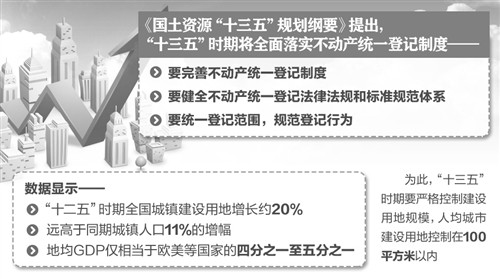 國土資源部今天公布的《國土資源“十三五”規(guī)劃綱要》提出,“十三五”時期將全面落實(shí)不動產(chǎn)統(tǒng)一登記制度。