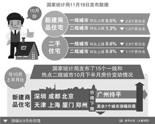 國(guó)家統(tǒng)計(jì)局城市司高級(jí)統(tǒng)計(jì)師劉建偉介紹,與10月份上半月比,10月份下半月新建商品住宅價(jià)格除深圳和成都2個(gè)城市繼續(xù)下降外,北京、天津、上海、廈門(mén)和鄭州等5個(gè)城市也由升轉(zhuǎn)降,降幅在0.1至0.4個(gè)百分點(diǎn)之間;其余7個(gè)城市新建商品住宅價(jià)格環(huán)比漲幅進(jìn)一步回落,回落幅度在0.4至3.3個(gè)百分點(diǎn)之間。
