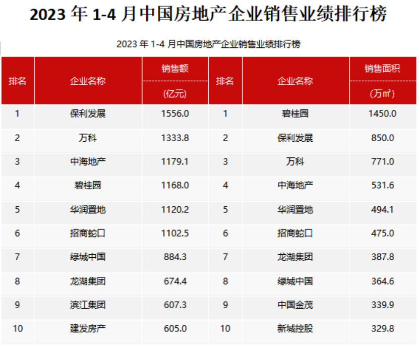 (圖源:中指研究院,央廣網(wǎng)發(fā)) 同時(shí),1-4月,千億以上陣營(yíng)房企6家,較去年同期增加3家,銷售額均值1243.3億元。第二陣營(yíng)(500-1000億)企業(yè)8家,較去年同期增加2家,銷售額均值636.4億元。第三陣營(yíng)(300-500億)企業(yè)3家,較去年同期減少4家,銷售額均值390.2億元。第四陣營(yíng)(100-300億)企業(yè)為42家,較去年同期增加1家,銷售額均值176.7億元。 此外,1-4月,各陣營(yíng)房企銷售均有提升。其中,TOP10房企銷售額均值為1023.1億元,較上年增長(zhǎng)17.1%;TOP11-30房企銷售額均值為337.8億元,較上年增長(zhǎng)18.5%,增速最快;TOP31-50房企銷售均值為155.8億元,較上年下降0.6%;TOP51-100房企銷售額均值為76.6億元,同比增長(zhǎng)4.8%。 綜合來看,劉水認(rèn)為,各陣營(yíng)房企緊抓政策端利好和購(gòu)房預(yù)期上升機(jī)遇,加速推盤,加大營(yíng)銷力度,銷售額均有一定提升。 頭部房企銷售增速較快,保利發(fā)展位居銷售額首位 據(jù)中指研究院統(tǒng)計(jì)數(shù)據(jù)顯示,保利發(fā)展以1556億元的銷售額位居首位,萬科銷售額為1333.8億元,排名第二位,而中海地產(chǎn)銷售額為1179億元,排名第三位。對(duì)此,劉水提到,頭部房企銷售增速較快,中小房企增速較慢。 從單月業(yè)績(jī)表現(xiàn)來看,克而瑞報(bào)告顯示,招商蛇口、濱江集團(tuán)、中國(guó)鐵建等企業(yè)實(shí)現(xiàn)單月業(yè)績(jī)環(huán)比增長(zhǎng),4月業(yè)績(jī)環(huán)比增長(zhǎng)的企業(yè)在百?gòu)?qiáng)房企中占比合計(jì)近3成;同時(shí)有近6成百?gòu)?qiáng)房企單月業(yè)績(jī)同比增長(zhǎng)。分梯隊(duì)來看,TOP10梯隊(duì)房企單月業(yè)績(jī)同比增長(zhǎng)的企業(yè)數(shù)量占比最高。其中,華潤(rùn)置地、招商蛇口、綠城中國(guó)、建發(fā)房產(chǎn)等房企4月的單月業(yè)績(jī)同比增幅均超過100%。 此外,克而瑞報(bào)告中也提到,濱江集團(tuán)、中國(guó)鐵建、保利置業(yè)、國(guó)貿(mào)地產(chǎn)等企業(yè)4月的業(yè)績(jī)表現(xiàn)也相對(duì)突出??傮w來看,央國(guó)企以及部分優(yōu)質(zhì)民企憑借熱點(diǎn)城市布局以及積極的推盤去化,表現(xiàn)出較強(qiáng)的抗周期韌性。
