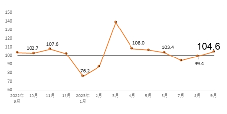 據中國建筑材料聯(lián)合會發(fā)布的數(shù)據顯示,2023年9月份建筑材料工業(yè)景氣指數(shù)為104.6點,較上月回升5.2點,高于臨界點,處于景氣區(qū)間,建筑材料工業(yè)運行有所恢復。