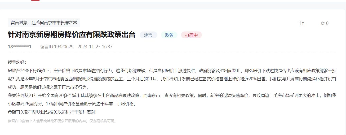 在領(lǐng)導(dǎo)留言板上,11月23日,有網(wǎng)友表示“針對南京新房期房降價應(yīng)有限跌政策出臺”。該網(wǎng)友留言道,“房地產(chǎn)經(jīng)濟下行趨勢下,房產(chǎn)價格下跌是市場選擇的行為,這我們都能理解,但是當初房價上漲過快時,政府能夠及時出面制止,那么房價下跌過快是否也應(yīng)該有相應(yīng)政策能夠干預(yù)呢?我是今年8月于南京市棲霞區(qū)西崗街道瀧悅雅頌購房的業(yè)主,3個月后的11月,我們得知開發(fā)商已經(jīng)在備案價格基礎(chǔ)上降價接近20%出售。我們?nèi)ヅc開發(fā)商協(xié)商溝通補償并沒有成功,原因是他們覺得這屬于正常市場行為。 我關(guān)注到從21年開始全國有20多個城市陸陸續(xù)續(xù)在出臺商品房限跌政策,而南京市一直沒有相關(guān)政策。同時,新房的過度快速降價,導(dǎo)致周邊二手房市場受到更大的沖擊,例如我小區(qū)總高26層的房,17層中間戶價格甚至低于周邊十年前二手房價格。”