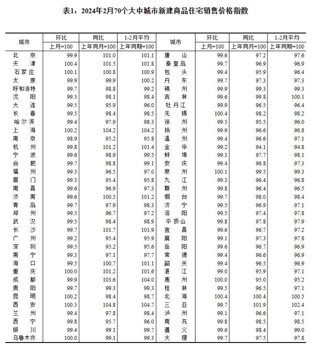 2024年2月70個大中城市新建商品住宅銷售價格指數(shù)。 截圖自國家統(tǒng)計局官網(wǎng)