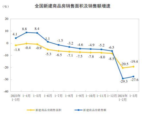 1—3月份,新建商品房銷售面積22668萬(wàn)平方米,同比下降19.4%,其中住宅銷售面積下降23.4%。新建商品房銷售額21355億元,下降27.6%,其中住宅銷售額下降30.7%。