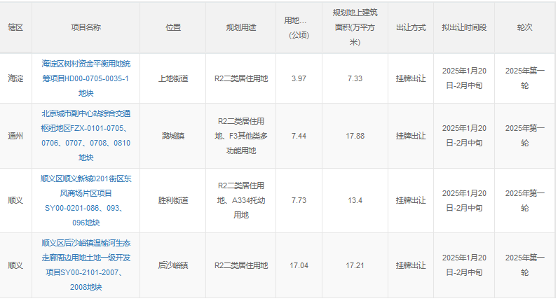 同一天,北京市規(guī)劃和自然資源委員會(huì)網(wǎng)站發(fā)布了2025年度第一輪擬供應(yīng)商品住宅用地清單,共涉及4宗地,土地面積約36.18公頃,建筑規(guī)模約55.82萬(wàn)平方米,將于2025年2月中旬供應(yīng)。整體來(lái)看,本輪推出地塊均位于市場(chǎng)需求突出、基礎(chǔ)設(shè)施和公共服務(wù)配套較好的區(qū)域,共涉及海淀、城市副中心、順義新城和后沙峪4宗地。