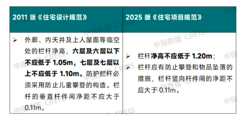 2011版《住宅設(shè)計(jì)規(guī)范》按住宅層數(shù)對(duì)陽(yáng)臺(tái)欄桿高度提出了不同要求,2022版《住宅項(xiàng)目規(guī)范》(征求意見(jiàn)稿)將陽(yáng)臺(tái)欄桿高度統(tǒng)一調(diào)整為1.1米,2025版新規(guī)再次將這一標(biāo)準(zhǔn)提高至1.2米。