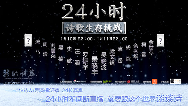 據(jù)了解,從1月10日晚22:00開(kāi)始,秦導(dǎo)邀請(qǐng)了24位各界知名人士,24小時(shí)不間斷直播接力談詩(shī)歌。自媒體“羅輯思維”創(chuàng)始人羅振宇,著名財(cái)經(jīng)作家、財(cái)經(jīng)自媒體“吳曉波頻道”創(chuàng)始人吳曉波,國(guó)際著名詩(shī)人楊煉,香港著名文化人梁文道,湖南衛(wèi)視著名主持人汪涵,自媒體人袁岳,著名知識(shí)分子余世存,詩(shī)人余秀華,詩(shī)人、詩(shī)歌自媒體“讀首詩(shī)再睡覺(jué)”公號(hào)主編流馬,編劇史航,金馬獎(jiǎng)最佳紀(jì)錄片導(dǎo)演周浩,歐洲著名漢學(xué)家柯雷,著名音樂(lè)人黑楠等人,將通過(guò)現(xiàn)場(chǎng)、電話連線、視頻等多種方式參與本次在線直播活動(dòng),而鳳凰衛(wèi)視著名主持人曹景行、著名主持人崔永元以及詩(shī)歌評(píng)論家唐曉渡也有望一起參與。