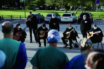 同樣在12日,葡萄牙最具民族特色的“法朵”音樂(lè)表演團(tuán)隊(duì)“月光小夜曲”來(lái)到首都里斯本的圣瑪利亞醫(yī)院,為醫(yī)護(hù)人員表演“法朵”樂(lè)曲,表達(dá)敬意。