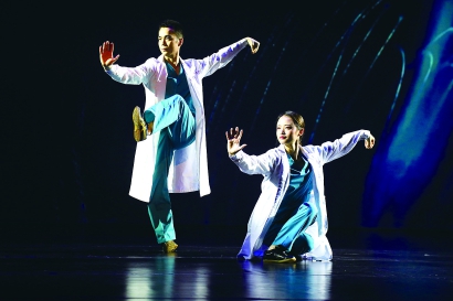 欣賞過《止戈抗疫》的觀眾有這樣的感覺:劇中的武術表演非常精彩,讓人耳目一新。比如一身白衣的醫(yī)護人員與一身黑衣的“新冠病毒”之間的拳法較量,有貼身肉搏,也有不接觸身體的打斗,醫(yī)護人員舍己為人的英勇形象非常飽滿。不僅是各路拳法,各種器械表演在劇中均有展現(xiàn),導演組根據(jù)不同職業(yè)的特點,為舞臺上各色人物設計妥帖的武術語言?!皠∏槔镂铇屌獎Σ惶侠恚跃桶哑餍等诤显诼殬I(yè)特點中。比如建筑工人用棍子來傳遞他背后的力量;快遞員的包裹設計成盾牌,表達風雨無阻的概念……”鄭思文解釋,運用武術獨有的肢體語言,以拳法、器械的技術動作為載體,將武術的專業(yè)技能與舞臺藝術的表現(xiàn)形式融合起來。