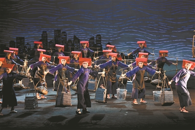 此次,觀眾在《紅頭巾》中看到了很多現(xiàn)代藝術(shù)手段。比如,3個男子男扮女裝去招工的舞蹈,不僅展現(xiàn)了傳統(tǒng)戲曲里的丑角特色,也讓人想到了近年來讓人捧腹的男版“四小天鵝”之舞。而尾聲處3個報童用說唱的形式播報1945年至1953年之間的重大新聞事件,也具有濃烈的現(xiàn)代性。這些歌舞化的運用都非常新穎,詼諧的表演,律動的節(jié)奏,調(diào)和了整個劇的氛圍和觀眾的情緒。