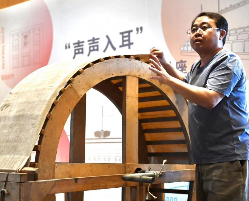 而看起來(lái)并不起眼的兩片三合板則是悶雷效果的制造者,隨著晃動(dòng),依靠空氣的震動(dòng),“雷聲”一聲緊似一聲,而這也成為經(jīng)典話劇《雷雨》中最重要的音效。雨聲則是靠扇子上串珠子的晃動(dòng)營(yíng)造出大珠小珠落玉盤(pán)的效果。據(jù)悉,早年間演出時(shí),后臺(tái)的畫(huà)面也十分震撼,十幾個(gè)人一人拿一塊板子分兩側(cè)而立形成矩陣,在指揮的引導(dǎo)下次第晃動(dòng),鄭晨說(shuō),“在沒(méi)有電聲、沒(méi)有便攜錄音設(shè)備的年代,一場(chǎng)《雷雨》因此也生動(dòng)傳神。”