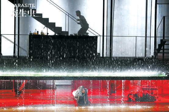 在這方如同社會(huì)切面的舞臺(tái)上,密集的戲劇沖突快速展開(kāi)。前半部分情緒高漲,金家人的把戲不斷得逞,做起了漫無(wú)邊際的美夢(mèng)。而隨著一場(chǎng)意外的大暴雨,故事急轉(zhuǎn)直下,三家人的矛盾即刻爆發(fā),奔向了格外慘烈的結(jié)局。在兩個(gè)多小時(shí)的表演中,演員們相當(dāng)賣(mài)力,飾演金家姐弟的郝蕾與馬天宇都交上了合格的答卷。在對(duì)姐姐金基婷一角的駕馭上,話劇表演經(jīng)驗(yàn)豐富的郝蕾顯然游刃有余,甚至?xí)層^眾感嘆她的演技有些大材小用。首次出演話劇的馬天宇也值得肯定。飾演金家父母的房子斌和趙紅薇堪稱全劇的靈魂,大段的臺(tái)詞、極致的情感落差對(duì)他們的體力和表演功底都提出了相當(dāng)高的要求。謝幕時(shí),觀眾格外熱烈的掌聲是給予演員的最好肯定。舞臺(tái)上,金父應(yīng)聘樸社長(zhǎng)司機(jī)、所有人為樸家小兒子演出慶生小戲劇等片段運(yùn)用了相當(dāng)風(fēng)格化的表演方式,在滑稽而悲涼的黑色幽默中,充分展現(xiàn)了舞臺(tái)藝術(shù)區(qū)別于電影的獨(dú)特虛擬性和表現(xiàn)力。
