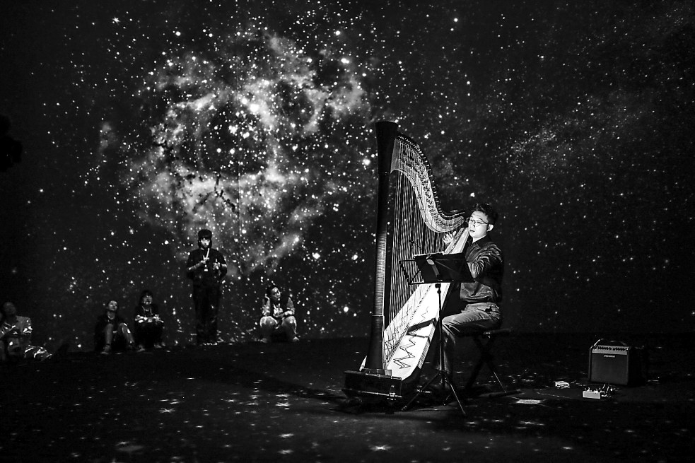 開幕當(dāng)天還舉辦了以“奔赴天文與藝術(shù)的宇宙浪漫”為題的論壇,圍繞展覽中的天文藝術(shù)作品展開討論。時(shí)代美術(shù)館執(zhí)行副館長(zhǎng)劉威威表示,展覽通過(guò)藝術(shù)化手段、人文關(guān)懷的角度呈現(xiàn)硬核科學(xué)知識(shí),讓公眾更好地認(rèn)知科學(xué),感受宇宙的浪漫。她相信,這樣“詩(shī)意的科普”與“科普的詩(shī)意”結(jié)合也許是未來(lái)科學(xué)藝術(shù)展的趨勢(shì)之一。論壇結(jié)束后,青年豎琴演奏家馬佳杰在星輝斑斕的展廳內(nèi)帶來(lái)了精彩的現(xiàn)場(chǎng)音樂會(huì)。展覽將持續(xù)至10月8日。