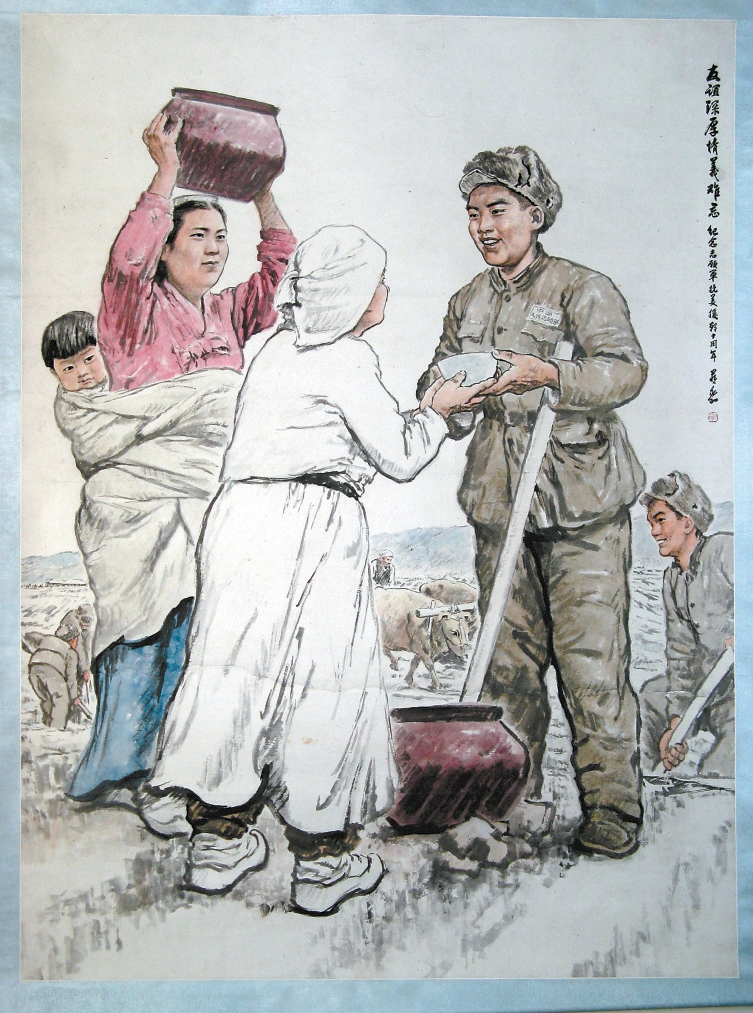 ??在展廳里,有一幅蔣兆和創(chuàng)作的中國畫《友誼深厚情義難忘》,畫中的“紀念志愿軍抗美援朝十周年”題跋道出了其創(chuàng)作的時間。畫面的主體是兩位朝鮮婦女正為志愿軍戰(zhàn)士送水,其中一位婦女還背著可愛的幼兒。在幾位主要人物的身后,畫家細致地描繪了志愿軍戰(zhàn)士們在農(nóng)田幫助朝鮮人民恢復農(nóng)業(yè)生產(chǎn)的場景。在中朝軍隊打退以美國為首的“聯(lián)合國軍”、朝鮮停戰(zhàn)協(xié)定簽訂后,志愿軍在鞏固防守的同時,還幫助朝鮮人民建設新家園,與朝鮮人民結(jié)下了深厚情誼。