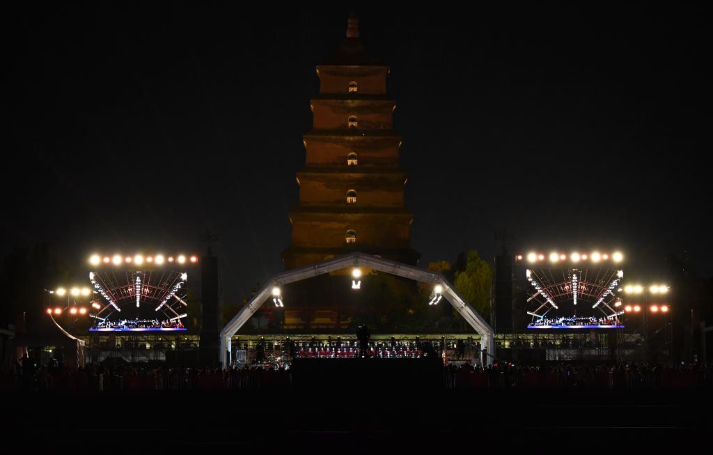 9月10日晚,西安交響樂團在西安大雁塔北廣場戶外公演。新華社記者 李一博 攝