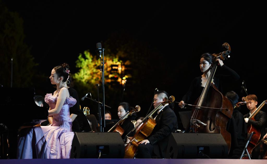 9月10日晚,鋼琴家吉娜·愛麗絲(前左)與西安交響樂團在西安大雁塔北廣場戶外公演。新華社記者 李一博 攝