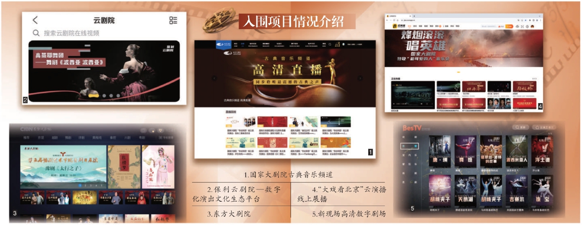 本次共入圍5個(gè)項(xiàng)目,分別為國(guó)家大劇院古典音樂(lè)頻道、保利云劇院——數(shù)字化演出文化生態(tài)平臺(tái)、東方大劇院、“大戲看北京”云演播線上展播、新現(xiàn)場(chǎng)高清數(shù)字劇場(chǎng)。入圍項(xiàng)目中有與專業(yè)院團(tuán)合作,策劃運(yùn)營(yíng)精品劇目線上展播,助力院團(tuán)和作品的品牌化建設(shè)與影響力提升的線上展播平臺(tái);有致力數(shù)字演藝內(nèi)容生產(chǎn)制作,探索成熟線上觀演模式的數(shù)字演藝服務(wù)項(xiàng)目;還有聚焦劇場(chǎng)、院團(tuán)、劇目藝術(shù)特色,兼顧線上藝術(shù)普及和線下演出引流的綜合服務(wù)平臺(tái)。