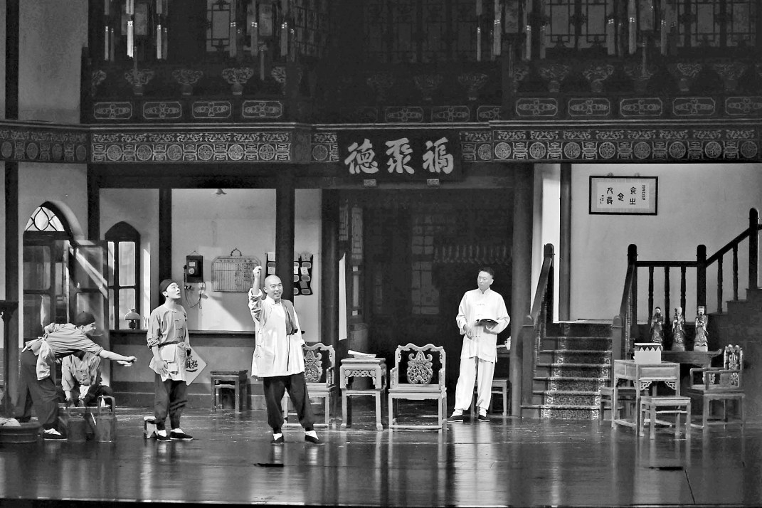 作為一部反映一百多年前生活的作品,導(dǎo)演閆銳認(rèn)為,要“找回歷史的記憶和時(shí)代的道”,在他看來(lái),“這版中的人物除了鮮活之外,尊嚴(yán)也是著力要展現(xiàn)的,我們也是在這個(gè)主旨下深耕人物,把握每一個(gè)細(xì)節(jié),力求在經(jīng)典的基礎(chǔ)上展現(xiàn)出年輕人的狀態(tài)。這部作品要向觀眾呈現(xiàn)當(dāng)時(shí)的生活畫卷,演員們不僅要還原當(dāng)時(shí)的生活,更要用當(dāng)時(shí)的語(yǔ)言方式和韻律來(lái)表達(dá)?!贝溯喸傺?,導(dǎo)演顧威提出“要不丟人、不丟范兒、不丟對(duì)傳統(tǒng)的尊重”。于是,新一輪的塑造仍要在人物上下功夫,同時(shí)對(duì)于作品的理解也要有新體會(huì)?!叭鐒≈械慕Y(jié)尾‘天下沒(méi)有不散的筵席’這樣具有智慧和哲思的臺(tái)詞,為什么由修鼎新這個(gè)角色說(shuō)出,帶有作者怎樣的思考,如何突出其中的哲思和況味,在這一輪的排演中,我們都進(jìn)行了重新的解讀和提升?!?/p>