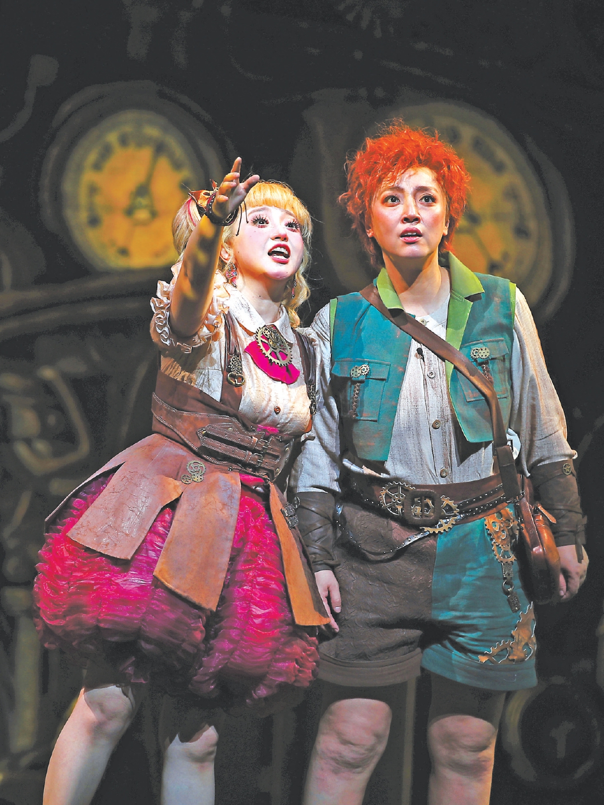 除了優(yōu)美的音樂和沉浸式的互動設計,該劇富有想象力的舞美還原了洪佩爾丁克筆下《漢塞爾與格蕾泰爾》溫馨、奇幻的絕妙特征。“在設計時,我試圖構建一個全新的場景,創(chuàng)造一個新奇的蒸汽朋克世界。”舞美設計常煒表示。在主要場景中,大量使用蒸汽朋克風格的機械元素,如齒輪、管道和機器零件作為舞臺布景的一部分,與《糖果屋》夢幻元素相融合,造型上以扭曲變形的表現(xiàn)手法,營造出奇幻而機械化的場景。古銅復古的色調加上少量鮮艷的色彩,為舞臺增添一種古老而神秘的氛圍,與夢境這場戲的夢幻元素形成有趣的對比。
